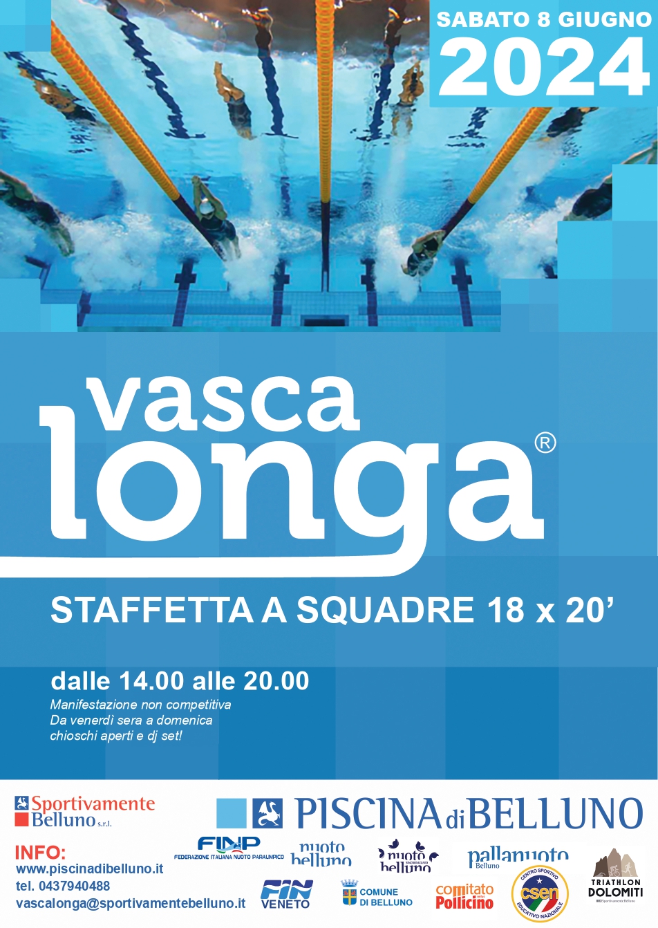 Sabato 8 giugno 2024 ritorna la Vascalonga, l’evento sportivo della piscina di Belluno, giunta quest'anno alla undicesima edizione.